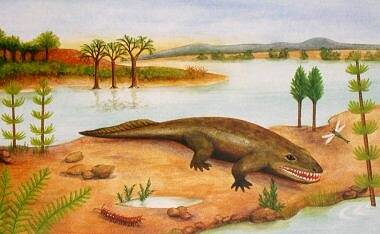 <-- Ichthyostega: lijkt op een vis maar heeft al poten.